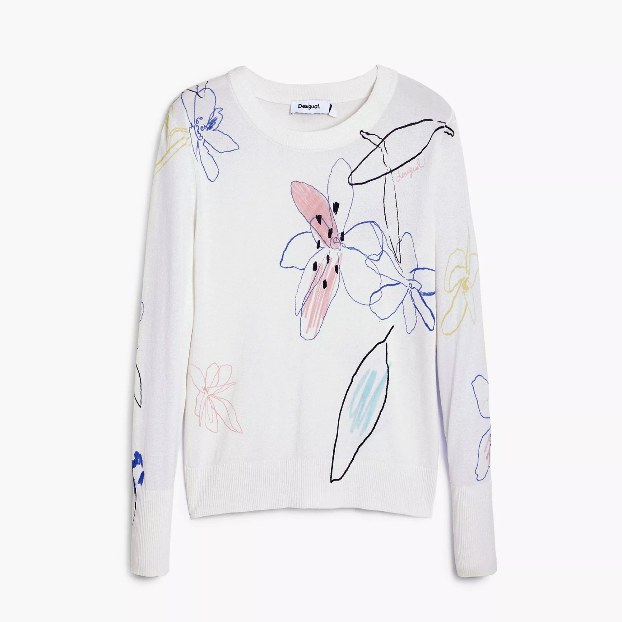 Desigual Women's White Floral Stroke Print Relaxed Fit Sweater